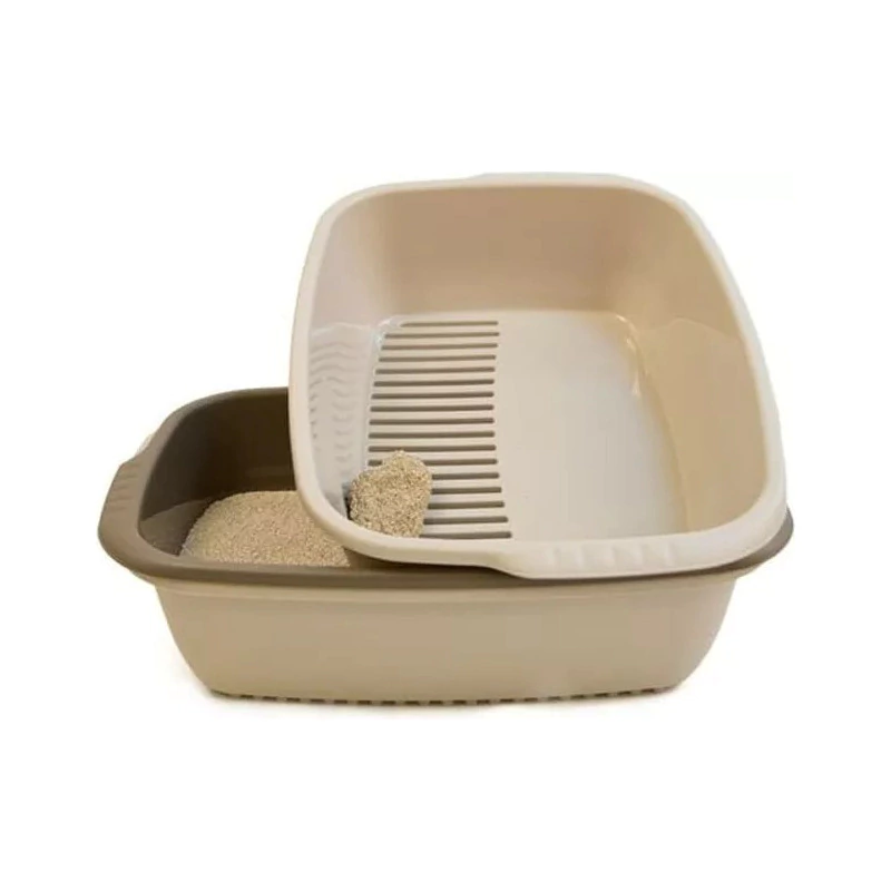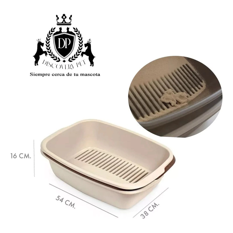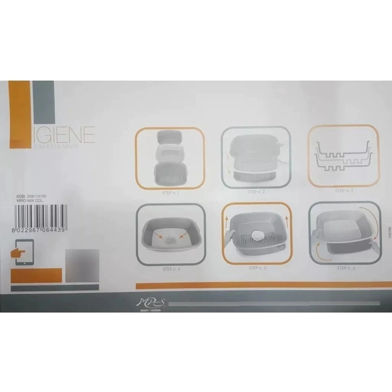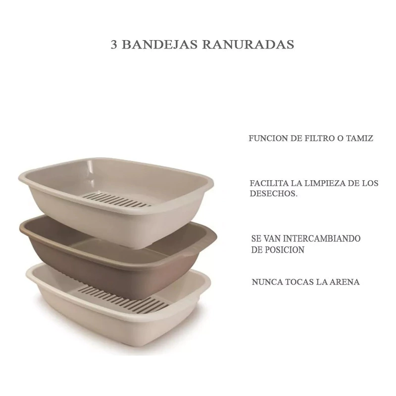 "El Sanitario Miso para Gato cuenta con un innovador e higiénico sistema de 3 bandejas ranuradas que ejercen la función de filtro o tamiz. Para limpiar y eliminar la arena aglomerada con las deposiciones u orina del gato sólo debe levantar la bandeja superior, sacudir y listo. Ya no necesitará pala.