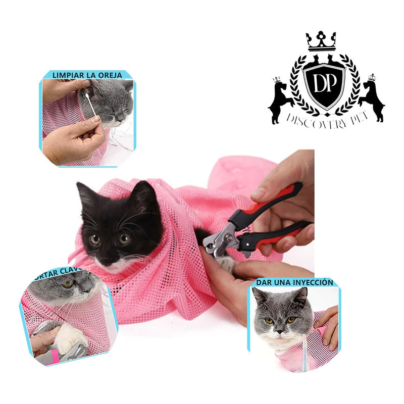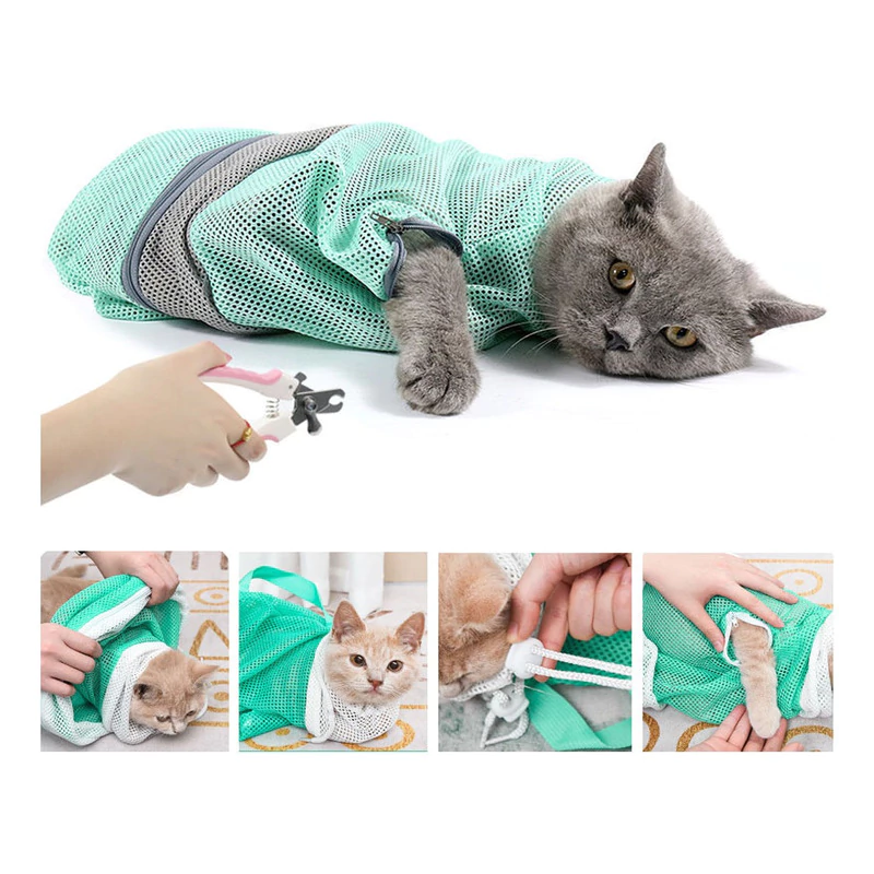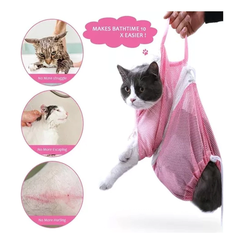 Bolsa de malla de ducha para gatos con 3 cordones: el cordón delantero y trasero evita que los dientes de gato, las garras delanteras y traseras se peguen para rayar a las personas;