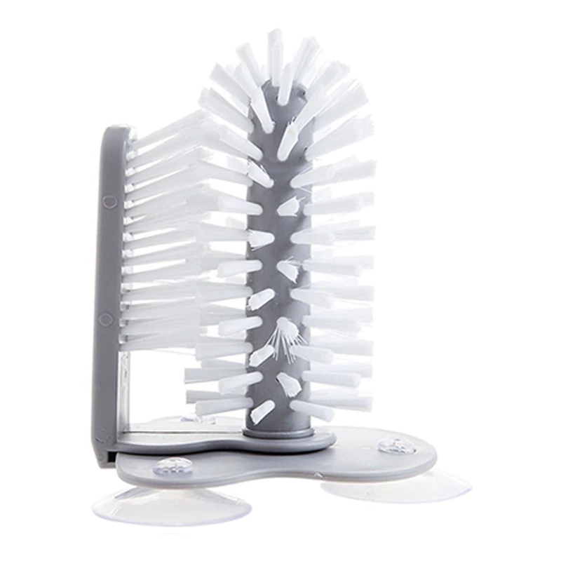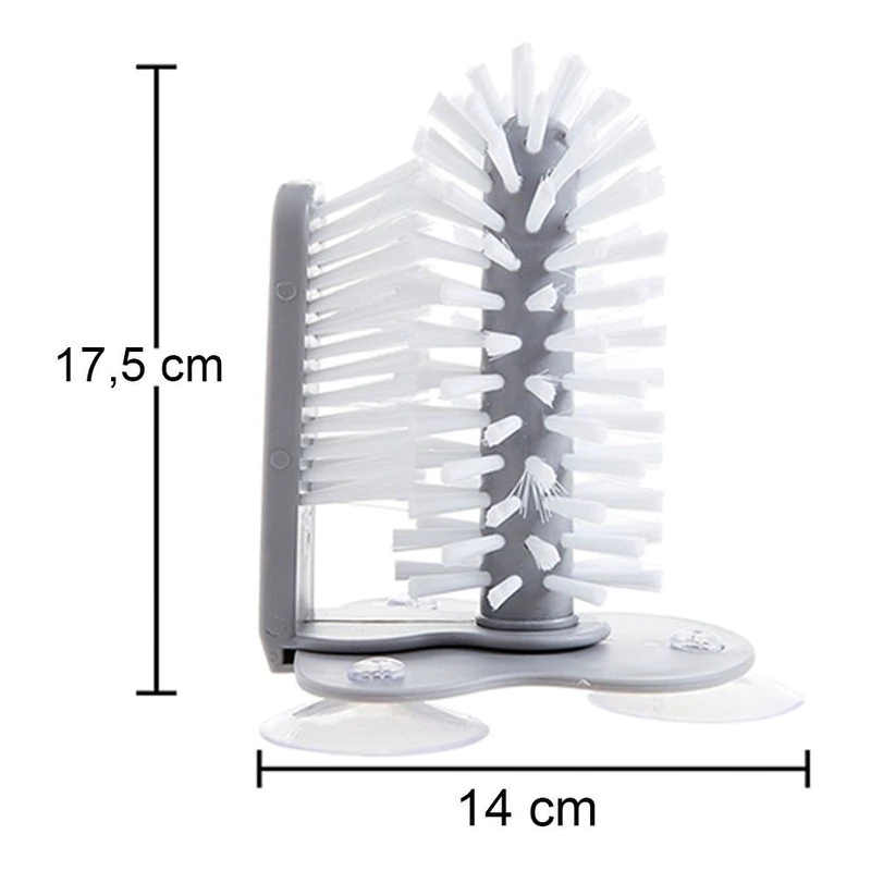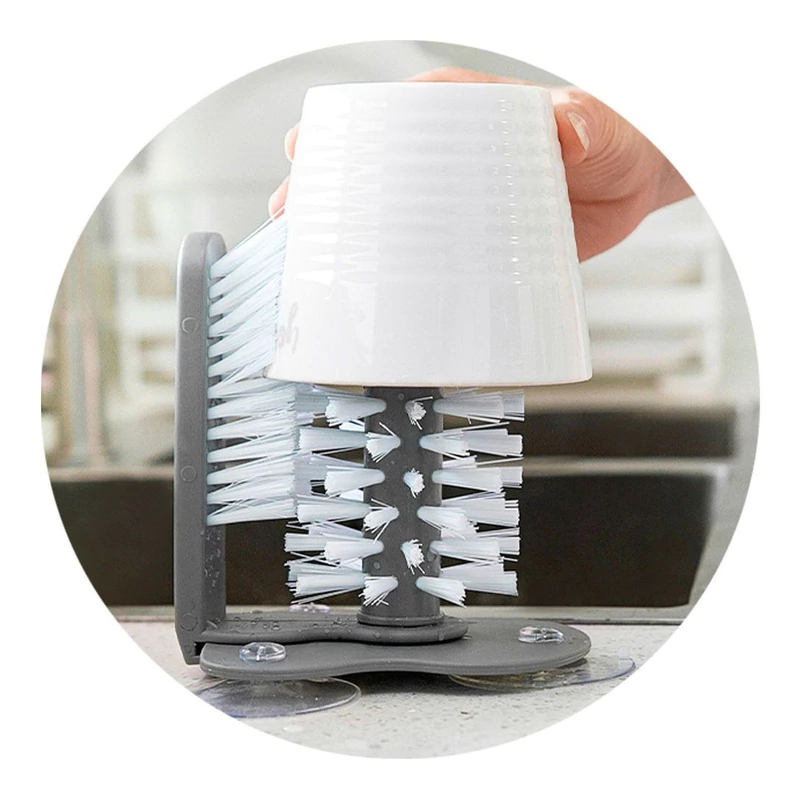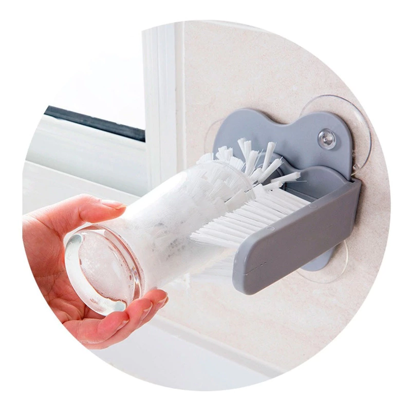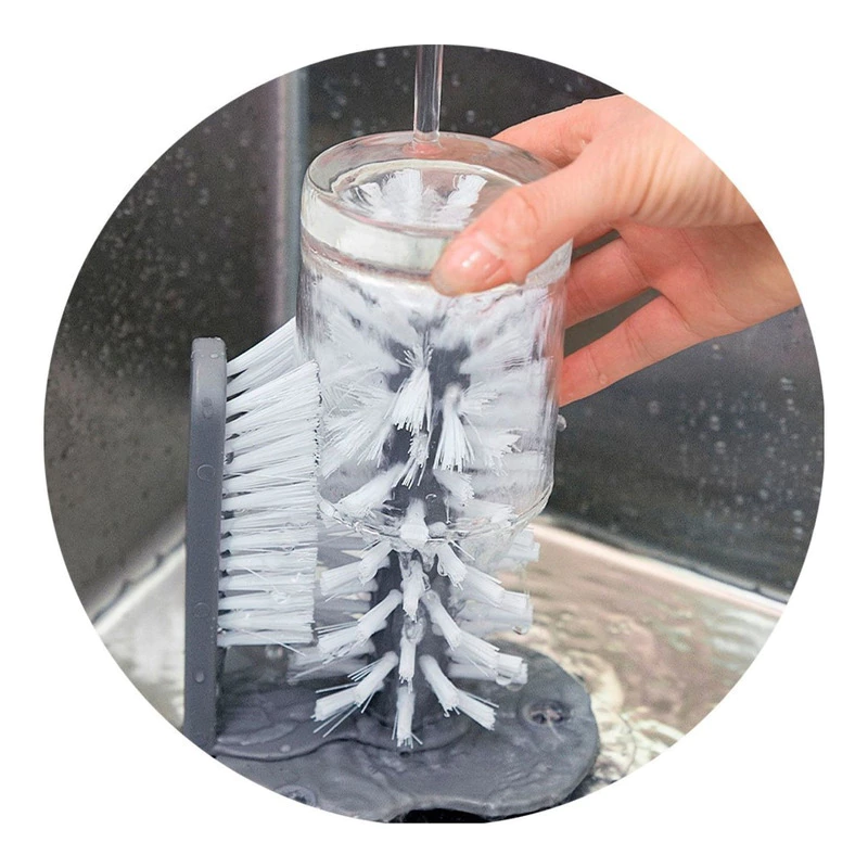 Hay tres grandes ventosas en la parte inferior del cepillo, la base de succión se fija firmemente a la mesa de pared o se fija a la parte inferior del fregadero, simplemente desliza el cristal entre los dos juegos de cerdas, cómodo de usar y limpiar.