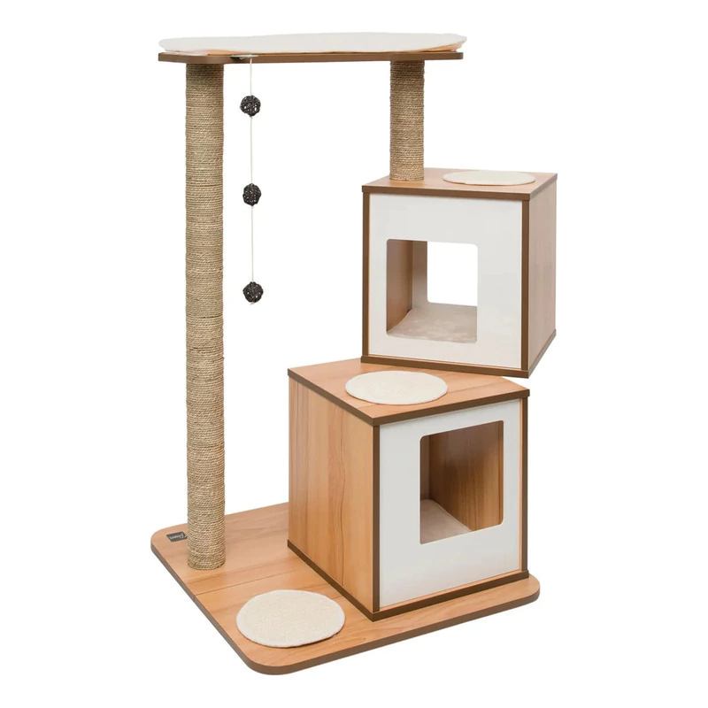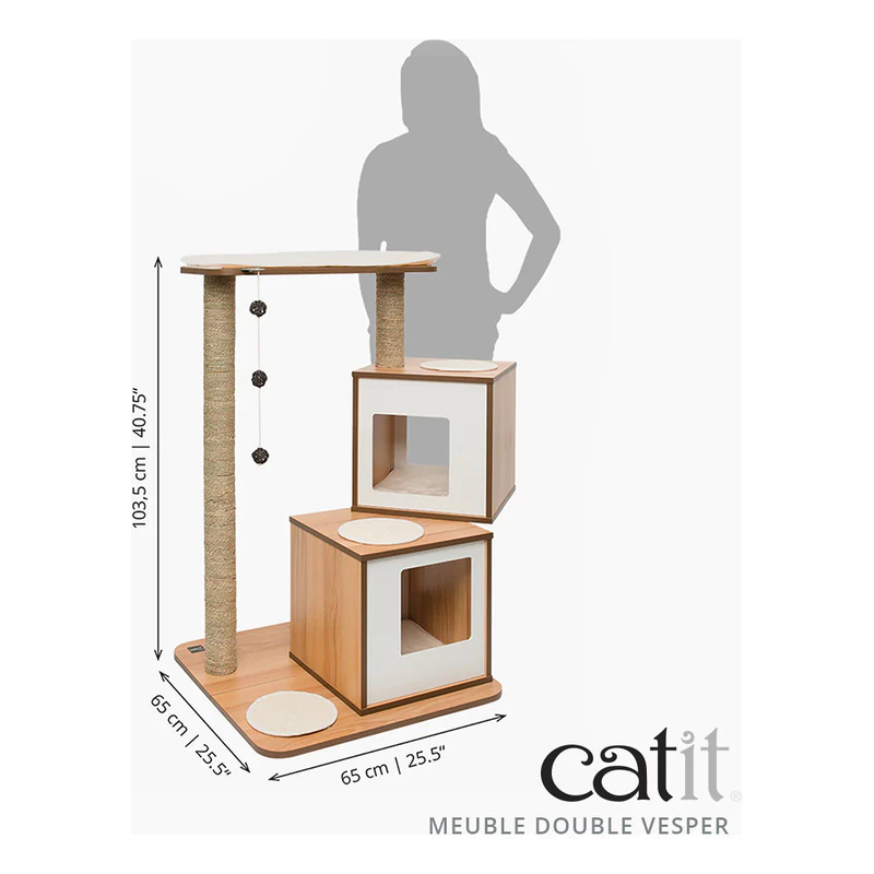 Con unas dimensiones de 65 cm de ancho y largo, y 103,5 cm de altura, el Vesper Double es ideal para gatos de todas las edades y tamaños. Además, cuenta con un juguete incorporado que estimula la curiosidad y el instinto de caza de tu mascota, proporcionando horas de diversión. Su peso de 24 kg asegura que se mantenga firme durante el uso, brindando un espacio seguro y cómodo para tu gato.