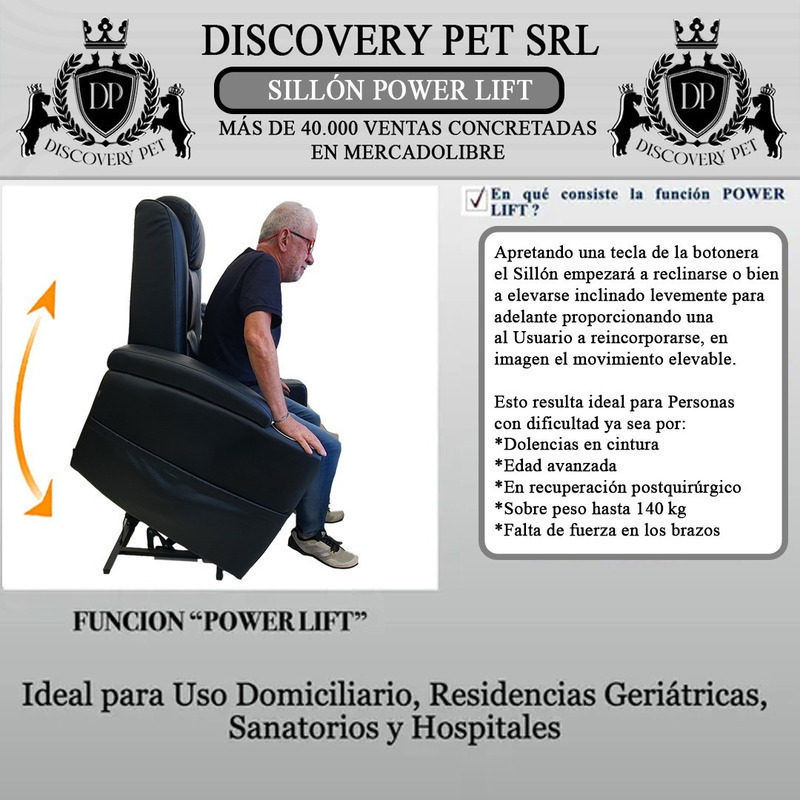 - Función POWER LIFT: Apretando una tecla de su sencillo control remoto el sillón completo se eleva desde su base, asistiendo al usuario a incorporarse del asiento.